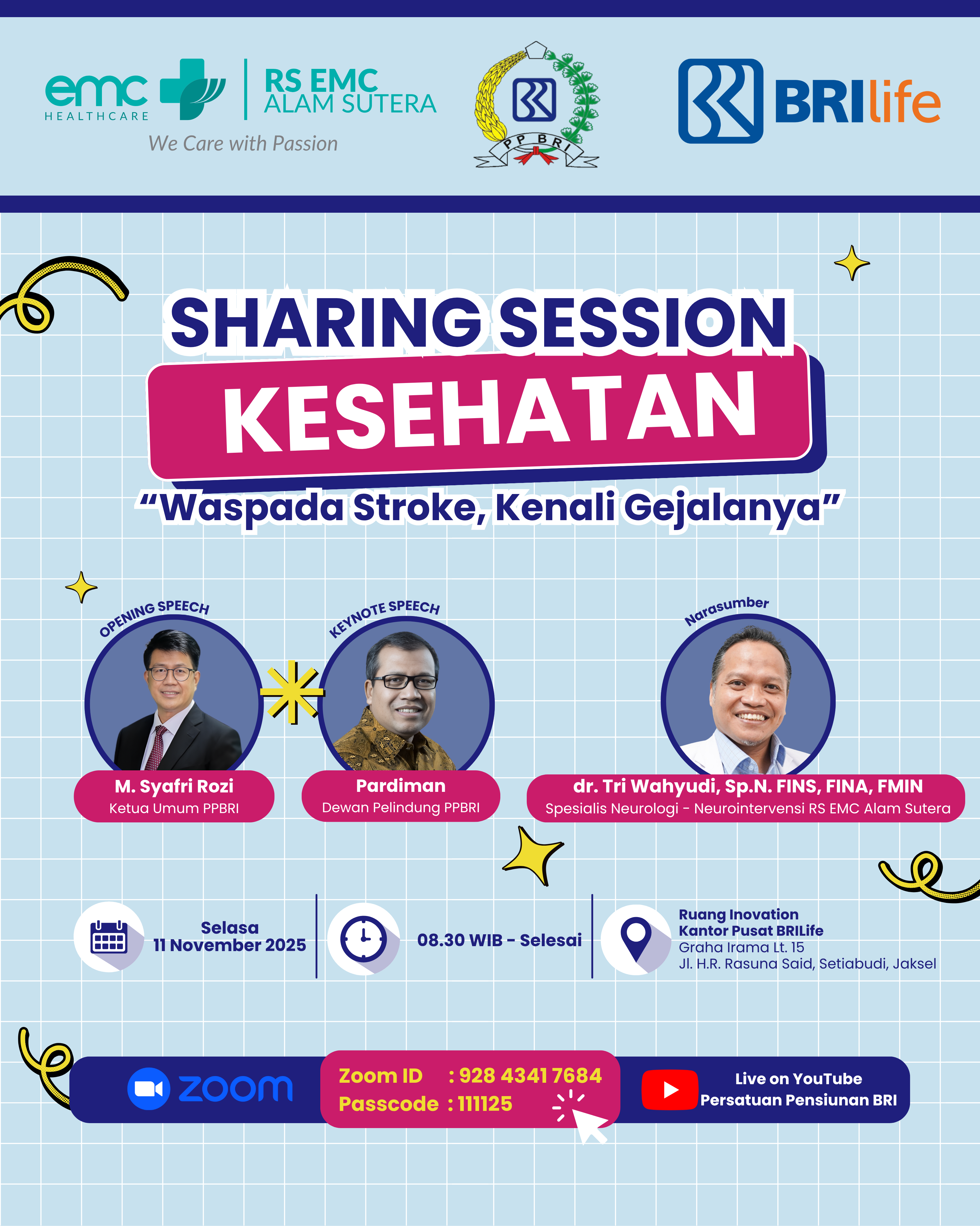 Dalam upaya meningkatkan kesadaran dan pemahaman mengenai pencegahan serta penanganan dini stroke, Persatuan Pensiunan BRI (PPBRI) bekerja sama dengan RS EMC Alam Sutera dan Asuransi Jiwa BRILife mengadakan kegiatan Sharing Session Kesehatan.